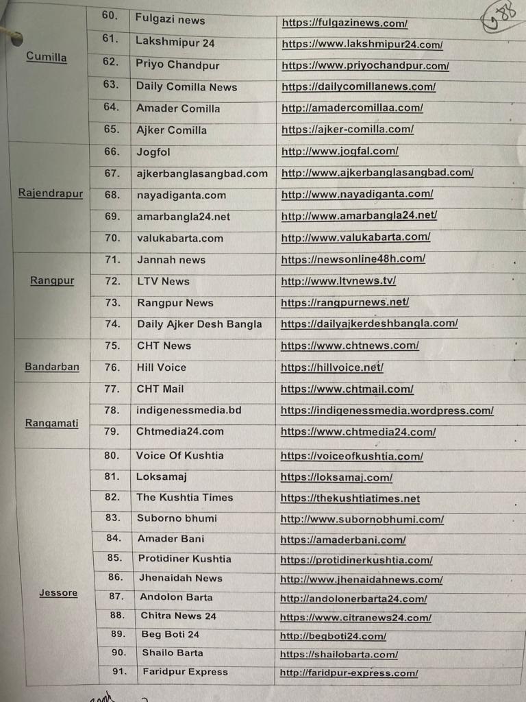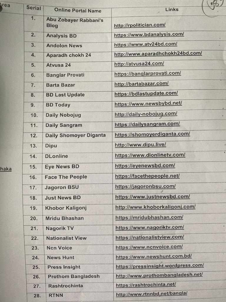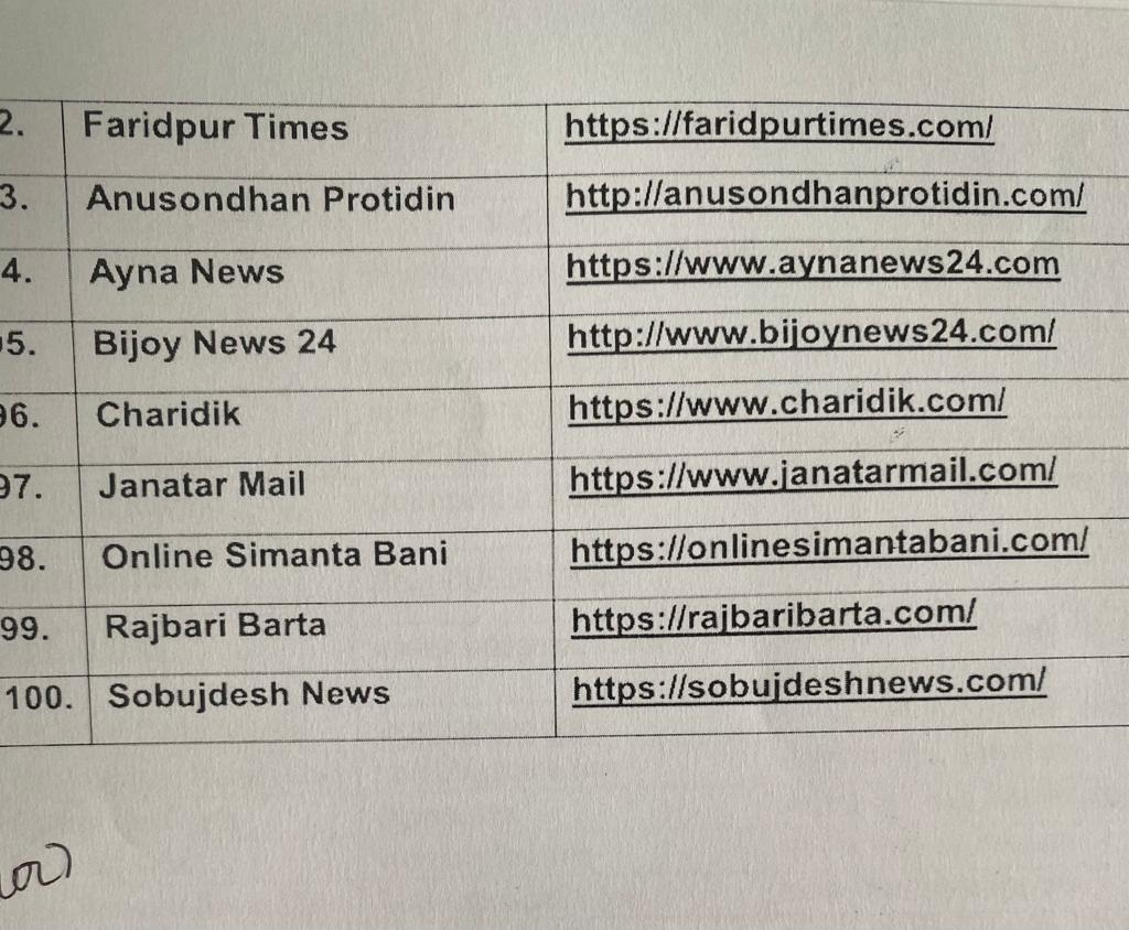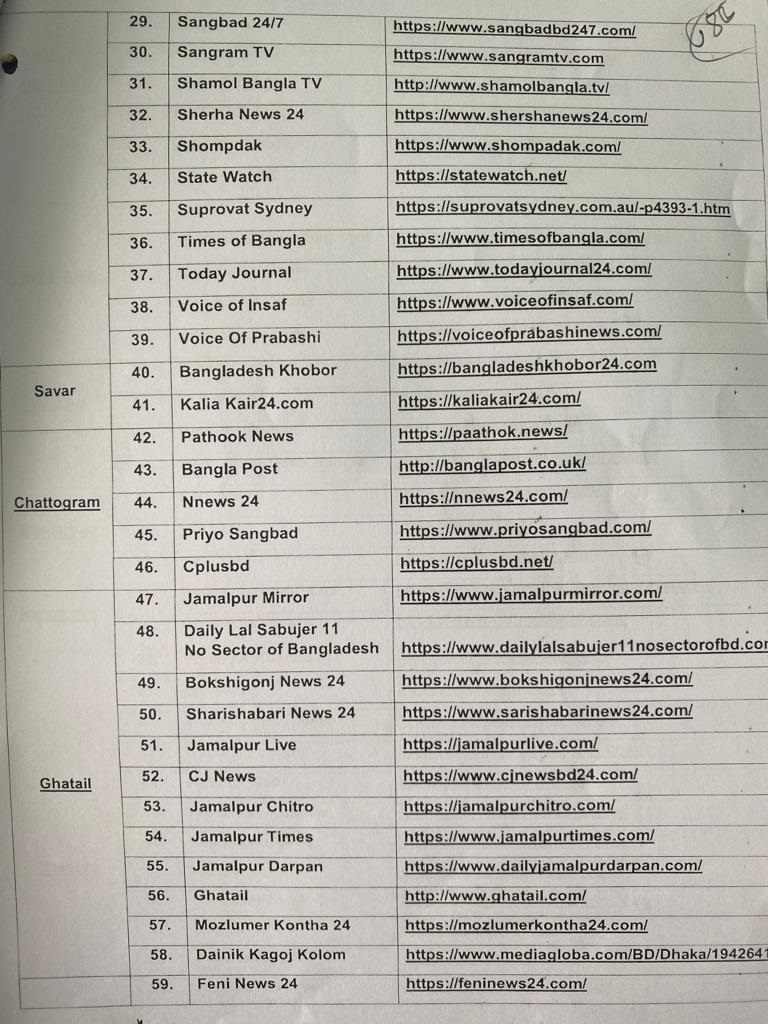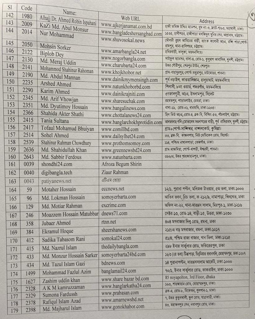 বিজ্ঞপ্তিতে অনিবন্ধিত ও অননুমোদিত ১৭৯টি নিউজ পোর্টালের ডোমেইন বরাদ্দ বাতিলকরণসহ লিংক বন্ধ করার অনুরোধ জানানো হয়। যে ১৭৮টি নিউজ পোর্টালের ডোমেইন বরাদ্দ বাতিলকরণসহ লিংক বন্ধ করা হয়েছে তার তালিকা নিম্নে দেওয়া হলো-