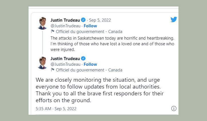 কানাডার সাচকাচুয়ান প্রদেশে ছুরি হামলার ঘটনা নিয়ে কথা বলেছেন দেশটির প্রধানমন্ত্রী জাস্টিন ট্রুডো। তিনি বলেছেন, এ হামলা ভয়ঙ্কর ও হৃদয়বিদারক।  তিনি বলেন, যারা তাদের আপনজনকে হারিয়েছেন এবং যারা আহত, তাদের প্রতি সমবেদনা জানাচ্ছি।