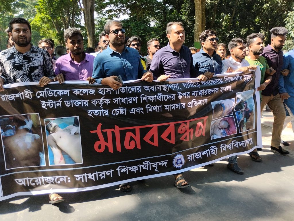 ৯ দফা দাবিতে মহাসড়ক অবরোধ করে রাবি শিক্ষার্থীর মানববন্ধন