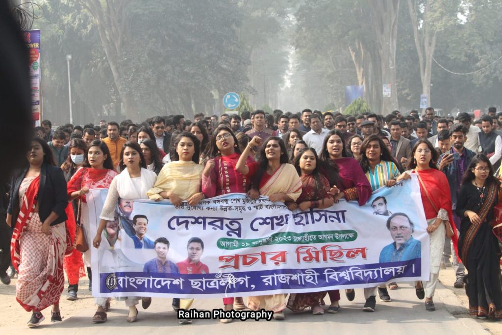 প্রধানমন্ত্রী শেখ হাসিনার রাজশাহীতে আগমন উপলক্ষ্যে রাজশাহী বিশ্ববিদ্যালয়ে প্রচার মিছিল করেছে ছাত্রলীগের নেতাকর্মীরা। মঙ্গলবার দুপুর সাড়ে ১২টায় দলীয় টেন্ট থেকে ছাত্রলীগের কেন্দ্রীয় সংসদের সভাপতি সাদ্দাম হোসেন ও সাধারণ সম্পাদক শেখ ওয়ালী আসিফ ইনানের নেতৃত্বে মিছিলটি শুরু হয়ে ক্যাম্পাস প্রদক্ষিণ করে।