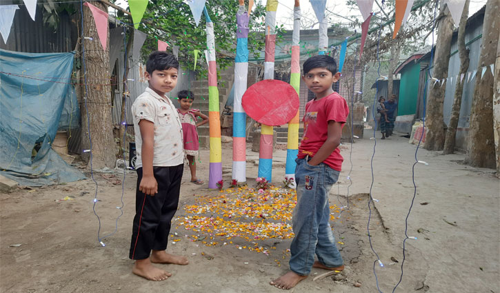 প্রতিটি মিনারের ওপর অপেক্ষাকৃত ছোট কলাগাছের আরও তিনটি টুকরা তির্যকভাবে আটকে দেওয়া হয়েছে। রঙিন কাগজ ও নানা রঙের ফুল দিয়ে প্রতিটি মিনার মুড়িয়ে দেওয়া হয়েছে। চারপাশে সুতা টানিয়ে তাতে রঙিন কাগজ ও বেলুন দিয়ে সীমানা নির্ধারণ করা হয়েছে। শহিদ বেদীতে বুনোফুল, গাঁদা ও গোলাপফুল শোভা পাচ্ছে। পাশেই সাউন্ড সিস্টেমে দেশাত্মবোধক গান বাজছে। কোথাও কোথাও ফুল দিয়ে শ্রদ্ধা জানানো শেষে ভোজের আয়োজনও করেছে শিশুরা।