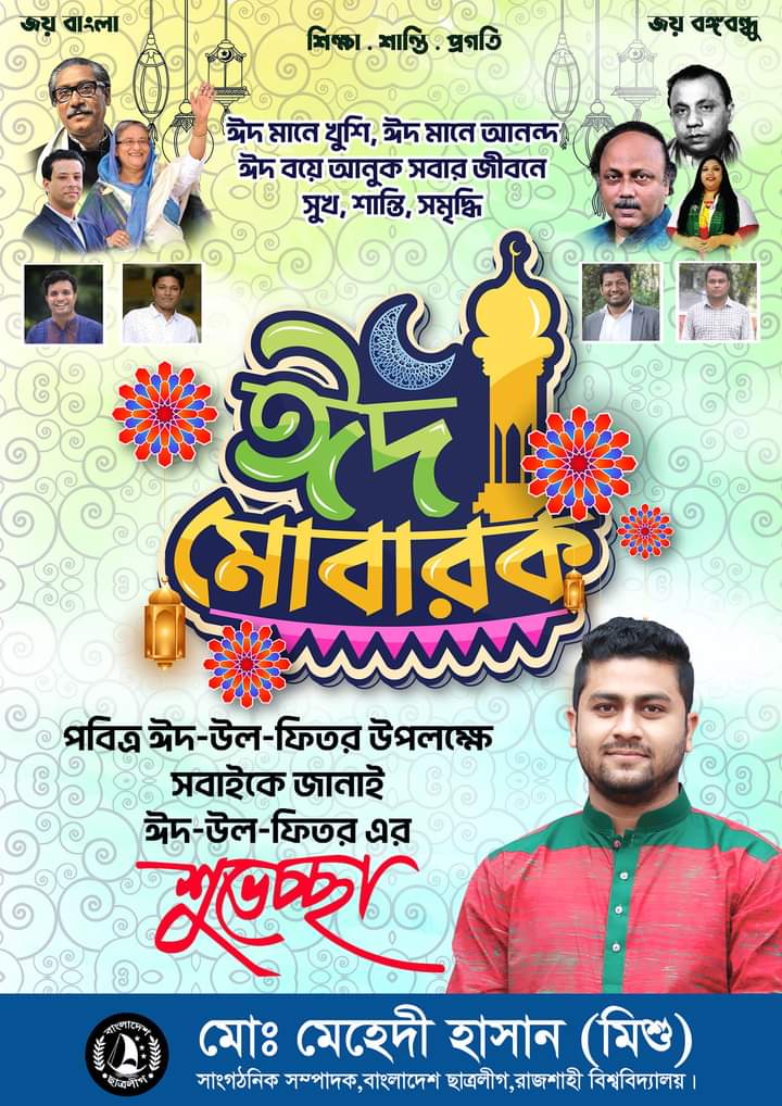 রাজশাহীবাসীকে পবিত্র ঈদুল ফিতরের শুভেচ্ছা জানালেন বাংলাদেশ ছাত্রলীগ, রাজশাহী বিশ্ববিদ্যালয় শাখা ছাত্রলীগের রাজশাহী বিশ্ববিদ্যালয় সাংগঠনিক সম্পাদক মো:মেহেদী হাসান(মিশু) বৃহস্পতিবার (২০ এপ্রিল) ঈদের শুভেচ্ছা জানিয়ে দেওয়া এক বিজ্ঞপ্তিতে তিনি সকল প্রকার অন্যায়, অনাচার, হানাহানি ও কুসংস্কার পরিহার করে শান্তির ধর্ম ইসলামের চেতনাকে ব্যক্তি, সমাজ ও জাতীয় জীবনের সকল স্তরে প্রতিষ্ঠার আহ্বান জানিয়েছেন। মেহেদী হাসান মিশু বলেন, ঈদ শান্তি, সহমর্মিতা ও ভ্রাতৃত্ববোধের অনুপম শিক্ষা দেয়। হিংসা-বিদ্বেষ ও হানাহানি ভুলে মানুষ সাম্য, মৈত্রী ও সম্প্রীতির বন্ধনে আবদ্ধ হয়। ঈদ ধনী-গরিব নির্বিশেষে সকলের জীবনে আনন্দের বার্তা বয়ে নিয়ে আসে। ঈদের আনন্দ আমাদের সবার। ঈদউৎসবের ঐকান্তিক কামনা। হাসি-খুশি ও ঈদের অনাবিল আনন্দে প্রতিটি মানুষের জীবন পূর্ণতায় ভরে উঠুক। বিশ্বের সকল মানুষের সুখ-শান্তি, কল্যাণ ও উত্তরোত্তর সমৃদ্ধি হোক আজকের দিনে আমি মহান আল্লাহর কাছে এই প্রার্থনা করি।