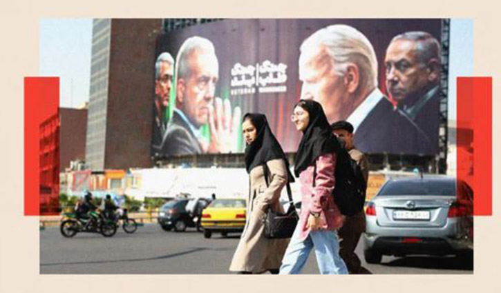 তেহরানের এই পোস্টারে এক দিকে ইরানের নেতারা, অন্য দিকে বাইডেন ও নেতানিয়াহু