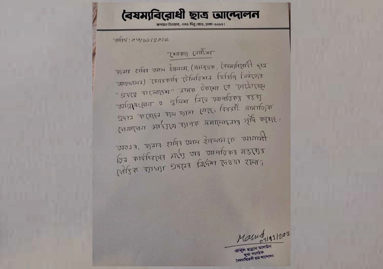 বিজ্ঞপ্তিতে বলা হয়েছে, হাসিব আল ইসলাম (সমন্বয়ক, বৈষম্যবিরোধী ছাত্র আন্দোলন) বেসরকারি টেলিভিশনের এক টকশোতে মেট্রোরেলে অগ্নিসংযোগ ও পুলিশ নিয়ে আপত্তিকর বক্তব্য প্রদান করেছেন বলে জানা গেছে। বিষয়টি সামাজিক যোগাযোগ মাধ্যমে ব্যাপক সমালোচনার সৃষ্টি করেছে।