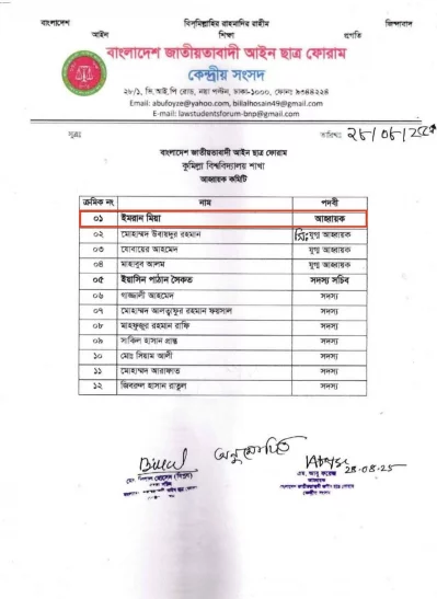 আজ (২৯ আগস্ট) বাংলাদেশ জাতীয়বাদী আইন ছাত্র ফোরামের কেন্দ্রীয় সংসদের এক প্রেস বিজ্ঞপ্তি দিয়ে এ কমিটি স্থগিত করেন।