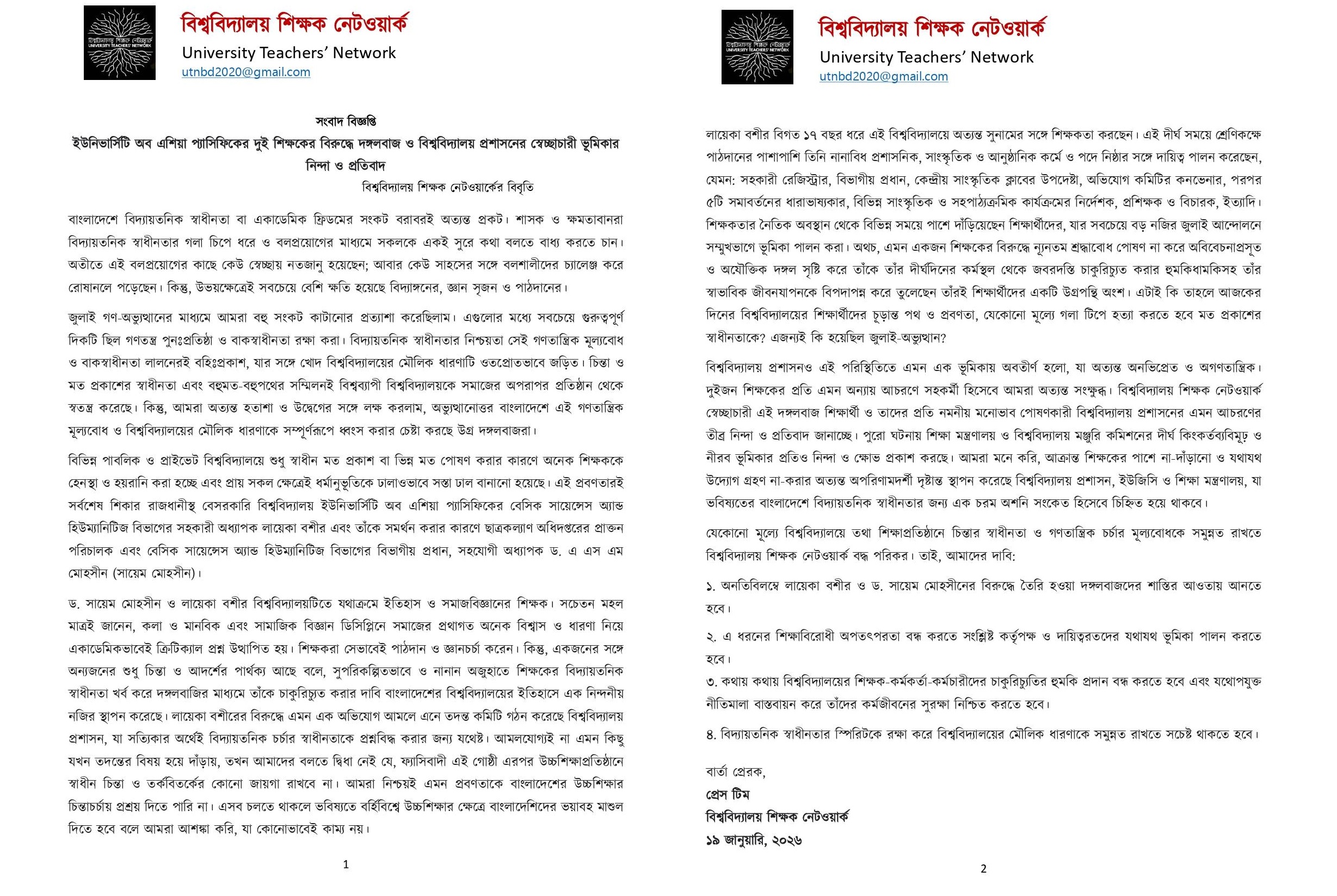এদিকে লায়েকা বশীর ও এস. এম মহসিনকে বহিস্কার করার নিন্দা ও প্রতিবাদ জানিয়েছে ‘বিশ্ববিদ্যালয় শিক্ষক নেটওয়ার্ক’। সংগঠনটি গতকাল এক বিজ্ঞপ্তিতে বলছে, শুধু চিন্তা ও আদর্শের পার্থক্য থাকায় সুপরিকল্পিতভাবে ও নানা অজুহাতে শিক্ষকের বিদ্যায়তনিক স্বাধীনতাকে দঙ্গলবাজির মাধ্যমে খর্ব করা হয়েছে। তা ছাড়া শিক্ষককে চাকরিচ্যুত করার দাবি বাংলাদেশের বিশ্ববিদ্যালয়ের ইতিহাসে এক নিন্দনীয় নজির স্থাপন করেছে বলেও মনে করে বিশ্ববিদ্যালয় শিক্ষকদের এই সংগঠনটি।