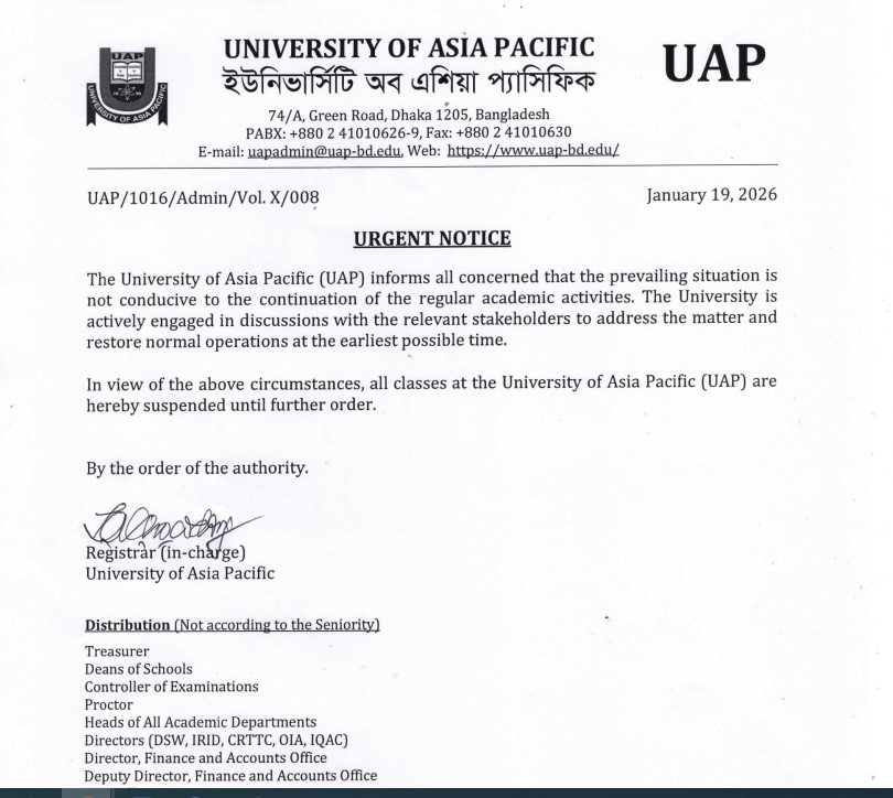 বিজ্ঞপ্তিতে আরও বলা হয়, ‘উপরোক্ত পরিস্থিতি বিবেচনা করে, ইউনিভার্সিটি অব এশিয়া প্যাসিফিকের সব ক্লাস সাময়িকভাবে স্থগিত করা হলো। পুনরায় কার্যক্রম শুরুর সময়পর্যন্ত এই স্থগিতাদেশ বলবৎ থাকবে।’