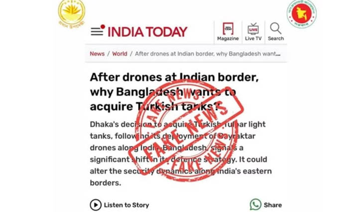 ভারতীয় সংবাদমাধ্যম ‘ইন্ডিয়া টুডে’ প্রকাশিত ‘ভারতীয় সীমান্তে ড্রোন মোতায়েনের পর, বাংলাদেশ কেন তুর্কি ট্যাংক কিনতে চায়?’ শিরোনামের সাম্প্রতিক প্রতিবেদনটি ভুয়া