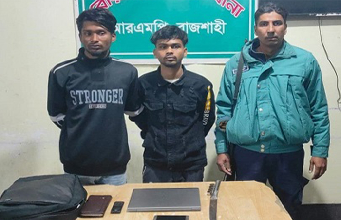রাজশাহী মহানগরীর বোয়ালিয়া থানার রাজশাহী শিক্ষাবোর্ড মডেল স্কুল অ্যান্ড কলেজের সামনে থেকে মোবাইল ফোন ও ল্যাপটপ ছিনতাইয়ের অভিযোগে দুই ছিনতাইকারীকে