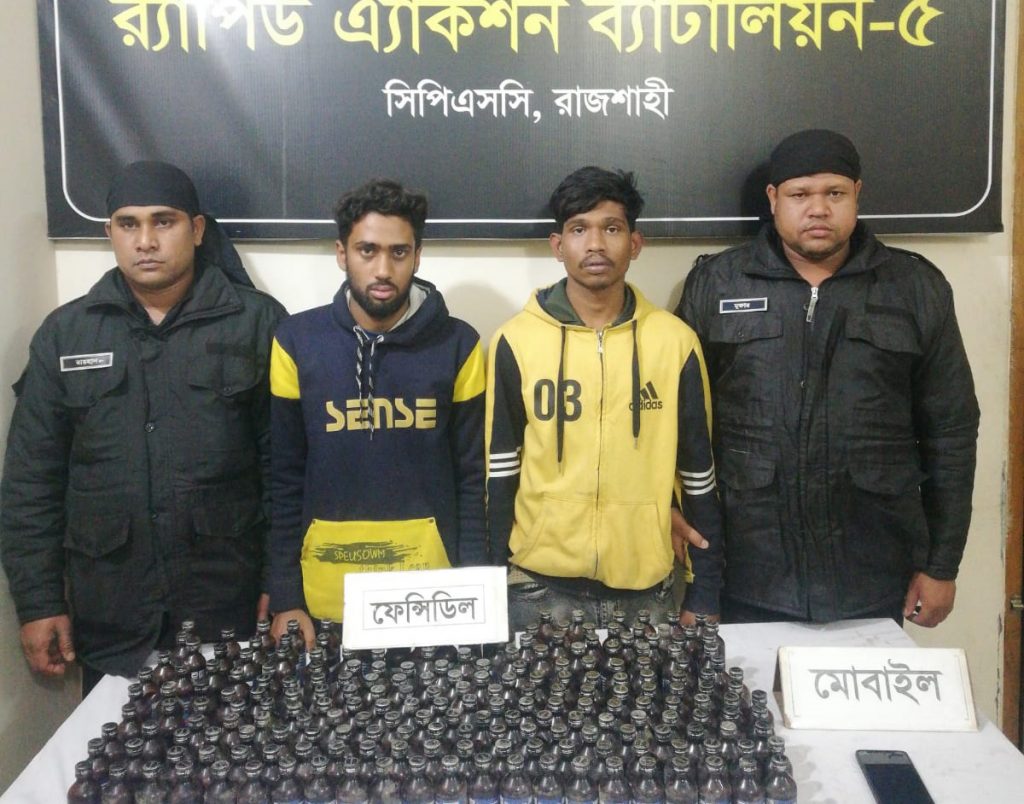 রাজশাহী র্যাব-৫ অভিযান চালিয়ে বিপুল পরিমান ফেন্সিডিলসহ ২ মাদক ব্যবসায়ীকে আটক করেছে। বুধবার দিবাগত রাত ১০ টার দিকে রাজশাহী নগরীর