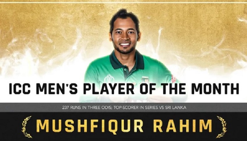 বাংলাদেশের প্রথম খেলোয়াড় হিসেবে আইসিসির প্লেয়ার অব দ্য মান্থ অর্থাৎ মাসের সেরা খেলোয়াড় নির্বাচিত হয়েছেন টাইগার উইকেটকিপার মুশফিকুর রহিম। শ্রীলঙ্কার
