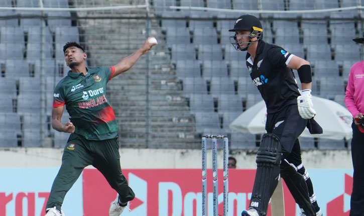 নিউ জিল্যান্ড: ২৬/২ (১০ ওভার) আগের দুই ওভার করে নাসুম দুই ওভারই মেডেন দেন। চাপে রাখেন কিউই ব্যাটারদের। সেই চাপ কাজে লাগিয়ে মোস্তাফিজ তুলে