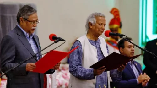 শেখ হাসিনার পতনের পর দায়িত্ব নেয় মুহাম্মদ ইউনূসের নেতৃত্বাধীন সরকার। ছবি: রয়টার্স নোবেলজয়ী ড. মুহাম্মদ ইউনূসের নেতৃত্বাধীন অন্তর্র্বতী সরকার বাংলাদেশে