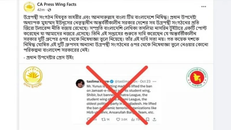 নিষিদ্ধ ঘোষিত উগ্রপন্থী সংগঠনের ওপর থেকে নিষেধাজ্ঞা তুলে নেওয়ার কোনো পরিকল্পনা বাংলাদেশ সরকারের নেই বলে জানিয়েছে প্রধান উপদেষ্টার প্রেস উইং।