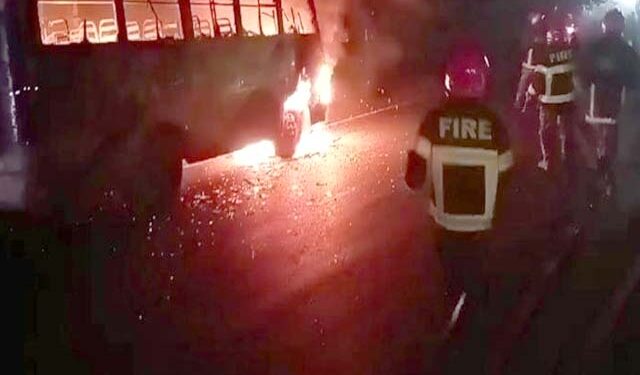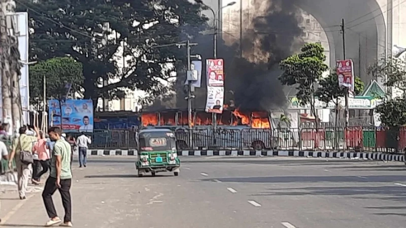 বায়তুল মোকাররমের সামনে শিকড় পরিবহনের বাসে আগুন