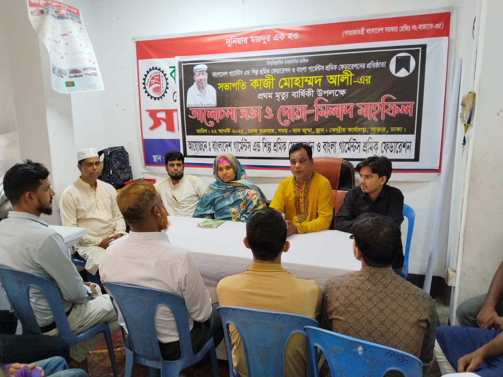 সাভারে বাংলা গার্মেন্টস শ্রমিক ফেডারেশনের প্রতিষ্ঠাতা সভাপতি বিশিষ্ট শ্রমিক নেতা মরহুম কাজী মোহাম্মদ আলীর প্রথম মৃত্যুবার্ষিকী উপলক্ষে আলোচনা সভা ও
