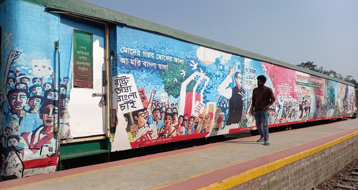 দিনাজপুরের বিরামপুর রেল স্টেশন। দুই নম্বর প্লাটফর্মে দাঁড়ানো একটি রেলের বগি। বগিটির বাহিরে বর্ণিলভাবে আঁকা ভাষা আন্দোলন,মুক্তিযুদ্ধ, আমাদের স্বাধীনতা ও