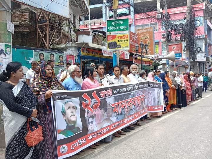 ২১ আগস্ট ভয়াল গ্রেনেড হামলার জড়িত সকল খুনিদের দ্রুত বিচারের দাবিতে মানববন্ধন কর্মসূচি পালন করেছে রাজশাহী সেক্টর কমান্ডারস ফোরাম- মুক্তিযুদ্ধ