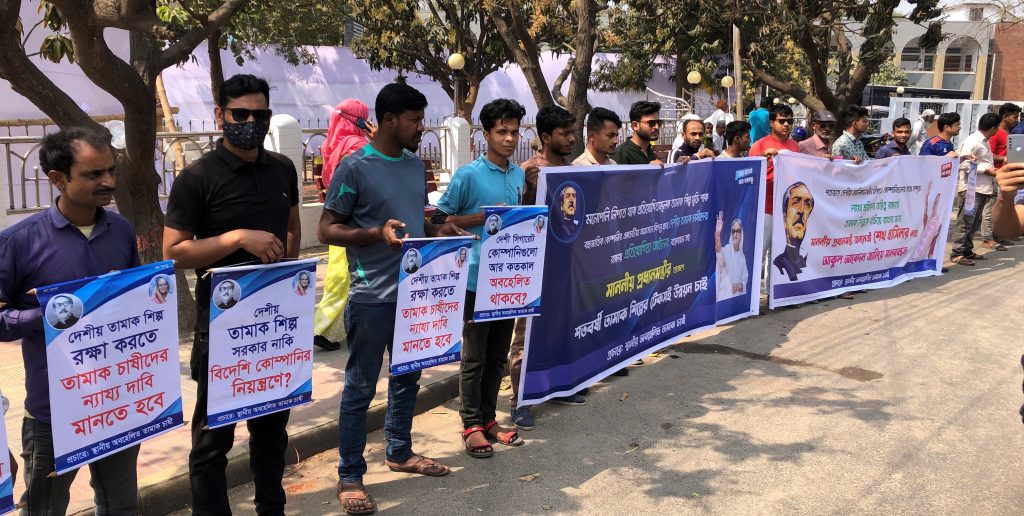 উচ্চ এবং মধ্যস্তরে আন্তর্জাতিক সিগারেটের ব্র্যান্ডকে উৎপাদনে সীমাবদ্ধ রেখে নিম্নস্তরের জন্য শুধু দেশী কোম্পানিকে সিগারেট উৎপাদনের সুযোগ দেওয়ার দাবিতে রাজশাহীতে