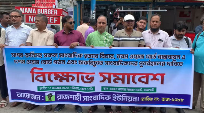 সাগর-রুনিসহ সকল সাংবাদিক হত্যার বিচার, নবম ওয়েজ বোর্ড বাস্তবায়ন, দশম ওয়েজ বোর্ড গঠন এবং চাকরিচ্যুত সাংবাদিকদের পুনর্বহালের দাবিতে রাজশাহীতে বিক্ষোভ