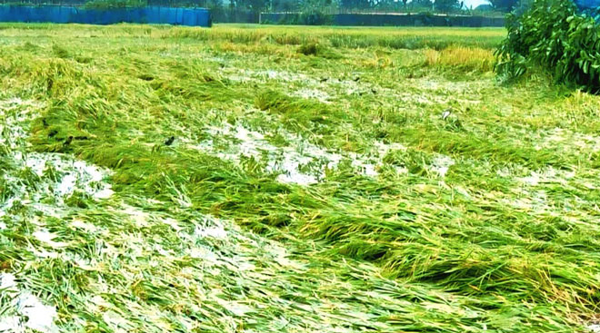 রাজশাহীর মোহনপুর উপজেলায় অতিরিক্ত বৃষ্টির কারণে রোপা আমন ধান মাটিতে নুয়ে পড়েছে। ফলন ঘরে তোলার আগমুহূর্তে আধাপাকা ধান মাটিতে মিশে