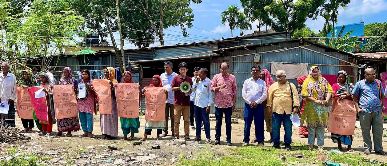 রাজশাহী নগরীর মোল্লাপাড়ায় পাহাড়িয়া সম্প্রদায়ের কয়েকটি পরিবারকে ভয় দেখিয়ে উচ্ছেদের প্রতিবাদে মানববন্ধন করেছে রাজশাহী বিশ্ববিদ্যালয়ের শিক্ষক শিক্ষার্থী সহ আদিবাসীদের স্বার্থরক্ষায়