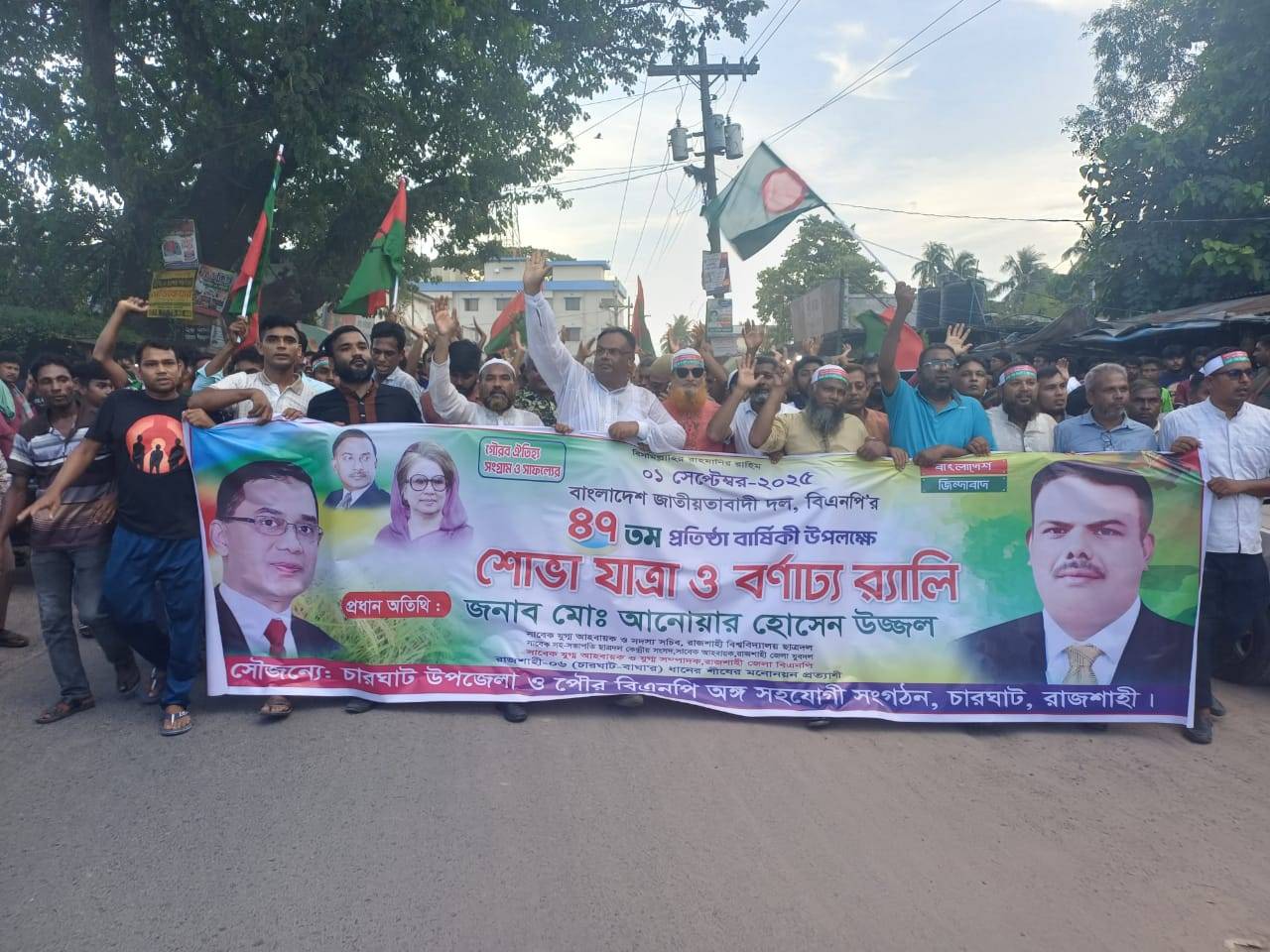 বাংলাদেশ জাতীয়তাবাদী দল (বিএনপি)-এর ৪৭তম প্রতিষ্ঠাবার্ষিকী উপলক্ষে রাজশাহীর চারঘাটে বর্ণাঢ্য র্যালি ও পথসভা অনুষ্ঠিত হয়েছে। ১৯৭৮ সালের এই দিনে তৎকালীন