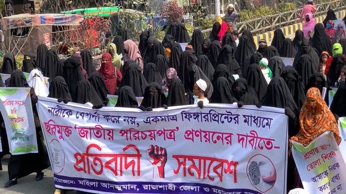 ছবি তুলে নয়, শুধু ফিঙ্গারপ্রিন্টের মাধ্যমে ছবিমুক্ত জাতীয় পরিচয়পত্র বা এনআইডি দেওয়ার দাবিতে রাজশাহীতে বিক্ষোভ সমাবেশ করেছেন পর্দানশীন নারীরা। মহিলা