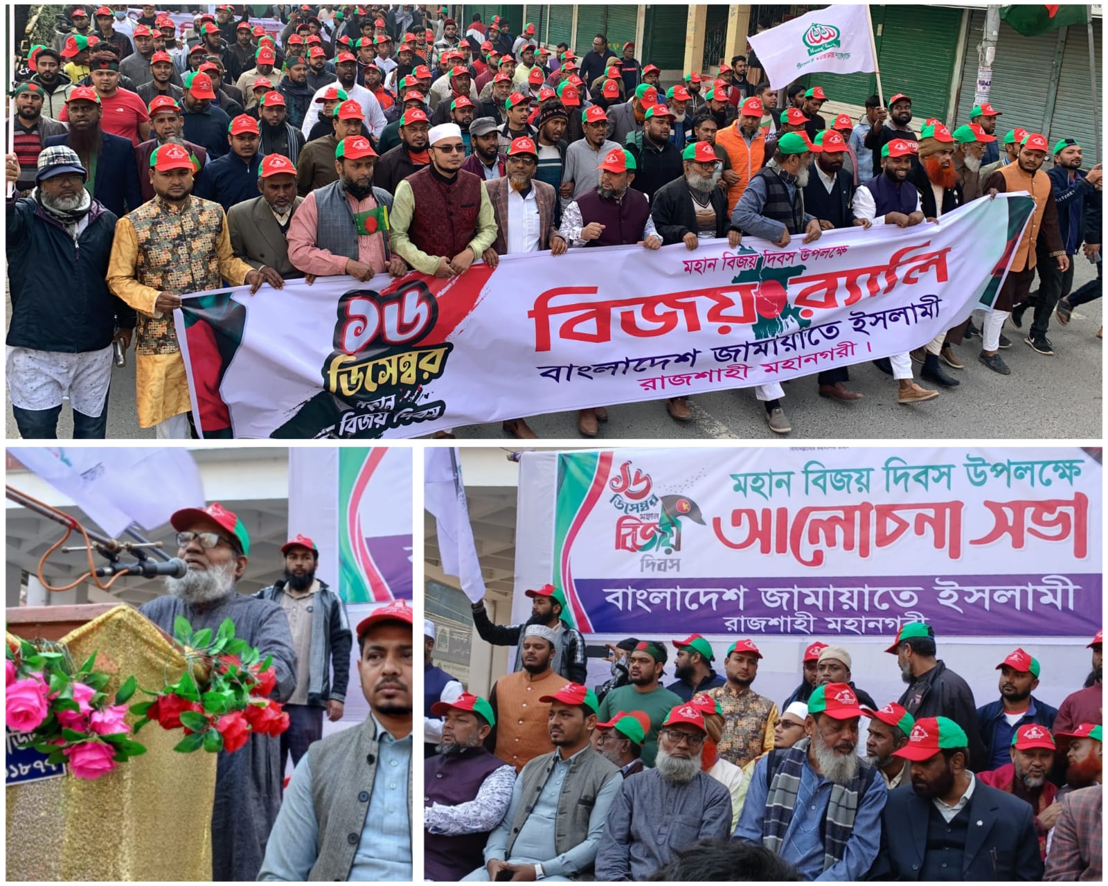 বাংলাদেশ জামায়াতে ইসলামী রাজশাহী মহানগরীর উদ্যোগে মহান বিজয় দিবস উপলক্ষে নগরীতে বর্ণাঢ্য বিজয় র্যালী ও আলোচনা সভা অনুষ্ঠিত হয়। বিজয়