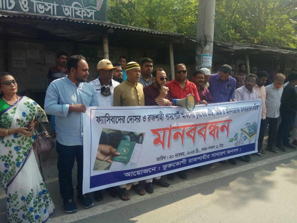 রাজশাহী আঞ্চলিক পাসপোর্ট অফিসের দুর্নীতি-অনিয়মের প্রতিবাদে মানববন্ধন