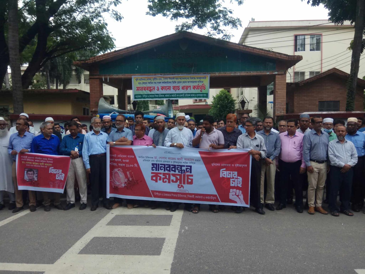 রাজশাহী মেডিকেল কলেজের চিকিৎসক ডা. গোলাম কাজেম আলী আহমেদ হত্যাকাণ্ডের ঘটনায় জড়িতদের গ্রেফতার ও দৃষ্টান্তমূলক শাস্তির দাবিতে মানববন্ধন অনুষ্ঠিত হয়েছে।