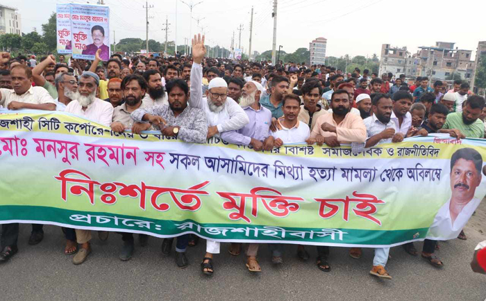 রাজশাহীর আলোচিত শাহেনশাহ্ হত্যা মামলার প্রধান আসামি রাসিকের ১নং ওর্য়াডের ৩ বারের নির্বাচিত কাউন্সিলর বিএনপি নেতা মুনসুর রহমানের মুক্তির দাবীতে
