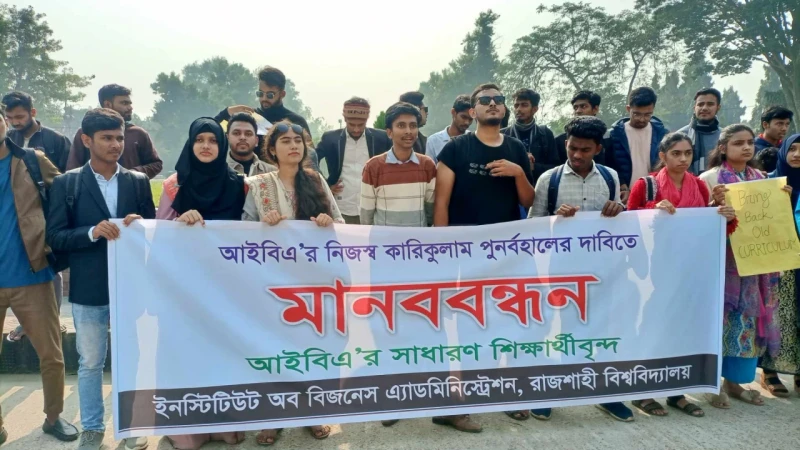 রাজশাহী বিশ্ববিদ্যালয়ের ইন্সটিটিউট অব বিজনেস অ্যাডমিনিস্ট্রেশনের (আইবিএ) নতুন প্রণীত কারিকুলাম বাতিল করে নিজস্ব কারিকুলাম পুনর্বহালের দাবিতে মানববন্ধন করেছে শিক্ষার্থীরা। আজ