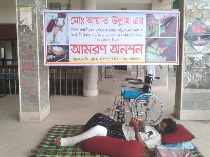 গত ৫ আগস্ট গভীর রাতে হামলার শিকার বরিশাল বিশ্ববিদ্যালয়ের মার্কেটিং বিভাগের শিক্ষার্থী আয়াত উল্লাহ আমরণ অনশন বসেছেন। বুধবার (১৬ আগস্ট)
