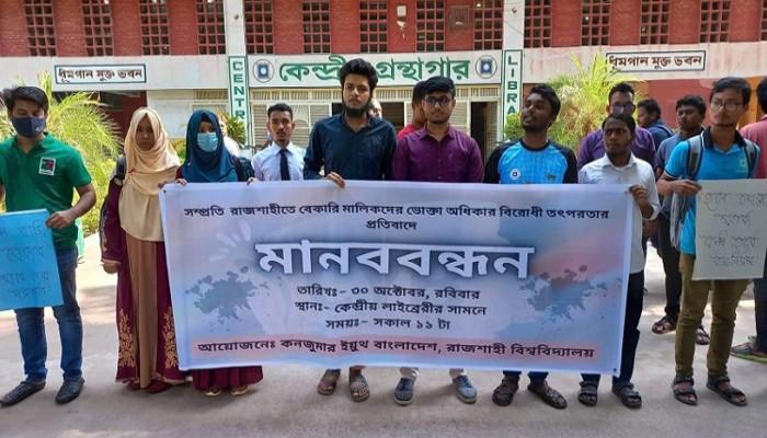 রাজশাহীতে ভোক্তা অধিকারবিরোধী তৎপরতায় বেকারি মালিক সমিতির বিরুদ্ধে প্রতিবাদ জানিয়ে মানববন্ধন করেছে ‘কনজুমার ইয়ুথ বাংলাদেশ’, রাজশাহী বিশ্ববিদ্যালয় (রাবি) শাখা। ভোক্তা অধিকার