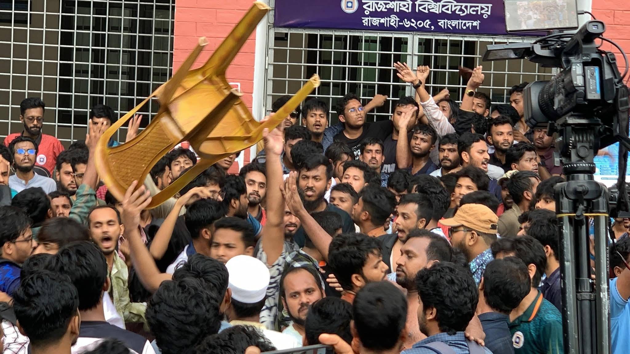 রাজশাহী বিশ্ববিদ্যালয় কেন্দ্রীয় ছাত্র সংসদ (রাকসু) নির্বাচন নিয়ে ক্যাম্পাসজুড়ে উত্তেজনা দেখা দিয়েছে। আজ রবিবার সকালে রাকসু কোষাধ্যক্ষের কার্যালয়ে চেয়ার-টেবিল ভাঙচুরের