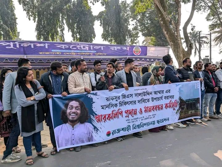 ‘আম্মারের ঠিকানা, পাবনা পাবনা’, ‘পাগলের ঠিকানা, পাবনা পাবনা’ স্লোগানে রাজশাহী বিশ্ববিদ্যালয়ে মানববন্ধন করেছে ছাত্রদল। সোমবার (১৯ জানুয়ারি) দুপুরে বিশ্ববিদ্যালয়ের প্যারিস