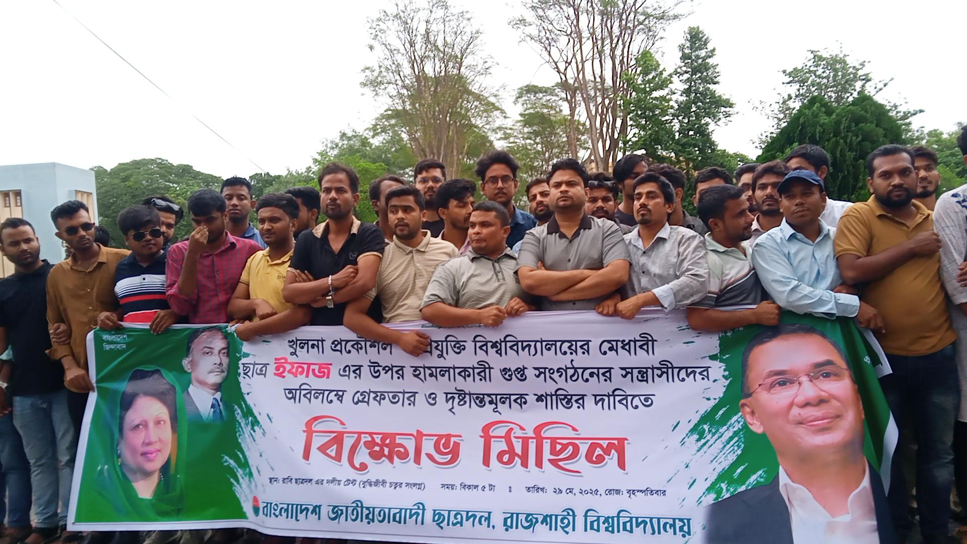 খুলনা প্রকৌশল ও প্রযুক্তি বিশ্ববিদ্যালয়ের (কুয়েট) শিক্ষার্থী ইফাজের উপর হামলাকারীদের গ্রেফতারের দাবিতে বিক্ষোভ মিছিল করেছে রাজশাহী বিশ্ববিদ্যালয় (রাবি) শাখা ছাত্রদল।