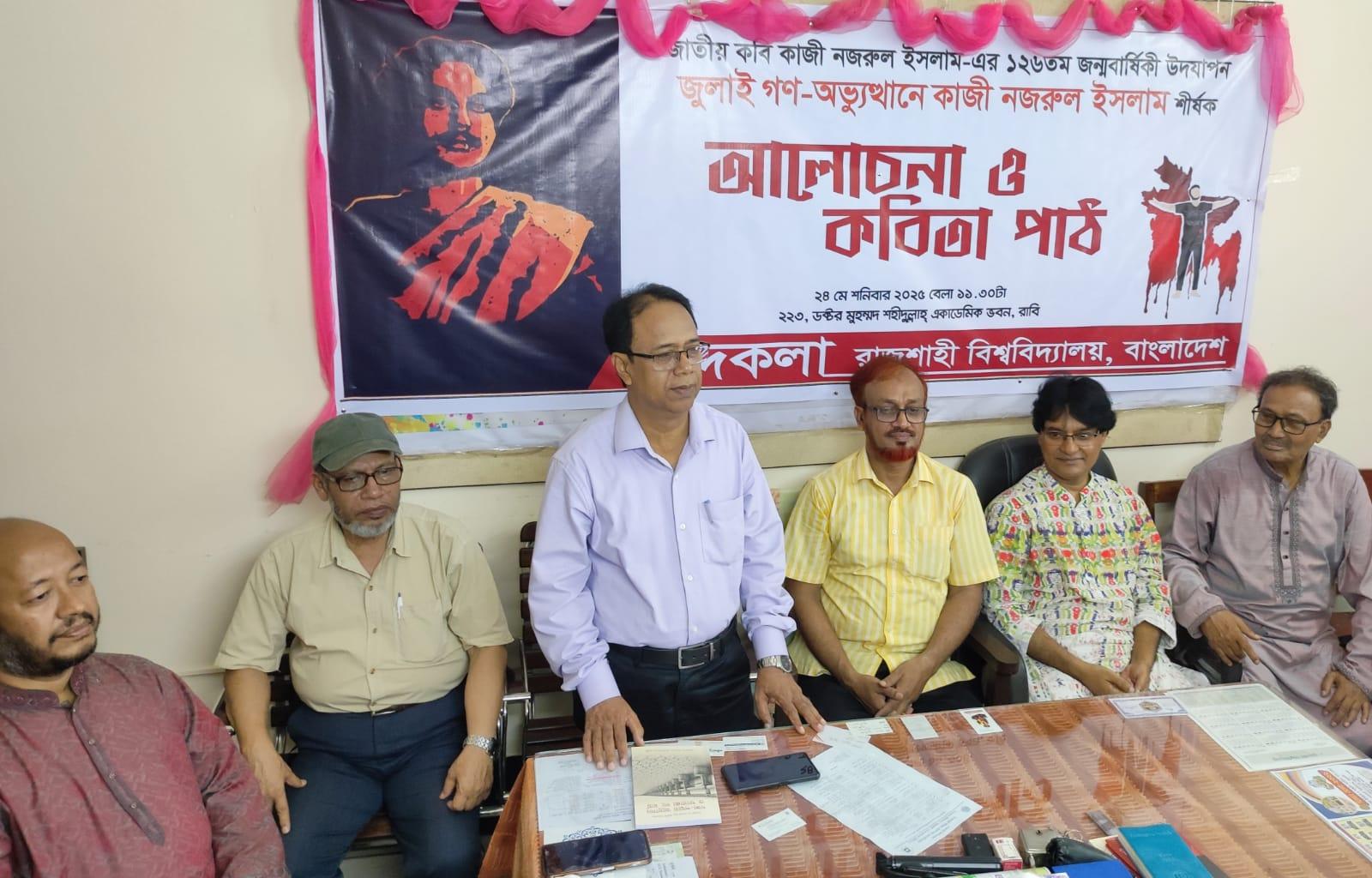 জাতীয় কবি কাজী নজরুল ইসলামের ১২৬তম জন্মবার্ষিকী উপলক্ষ্যে ‘জুলাই গণ-অভ্যুত্থানে কাজী নজরুল ইসলাম’ শীর্ষক আলোচনা ও কবিতাপাঠ অনুষ্ঠানের আয়োজন করে