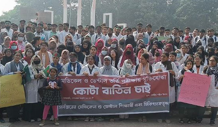 মেডিকেল ভর্তি পরীক্ষায় কোটা পদ্ধতি রাখার প্রতিবাদে ঢাকা বিশ্ববিদ্যালয়ে (ঢাবি) বিক্ষোভ মিছিল করেছেন শিক্ষার্থীরা। এ সময় তারা ‘কোটা না মেধা,
