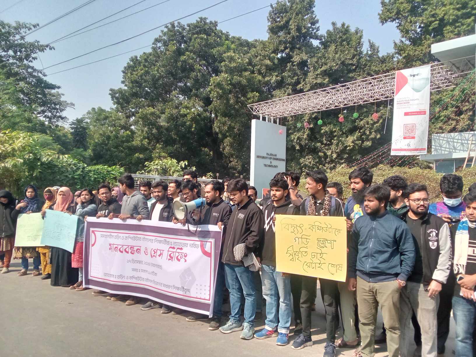 সরকারি চাকরিক্ষেত্রে তড়িৎ ও কম্পিউটার কৌশল (ইসিই) অন্তর্ভুক্তির দাবিতে মানববন্ধন করেছে রাজশাহী প্রকৌশল ও প্রযুক্তি বিশ্ববিদ্যালয়ের (রুয়েট) ইসিই বিভাগের শিক্ষার্থীরা।