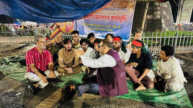 জুলাই বিপ্লবে ছাত্র-জনতার ওপর হামলাকারী সন্ত্রাসীদের গ্রেফতার ও বিচারের দাবিতে বৃষ্টিতে ভিজে আমরণ অনশন শুরু করেছিলেন ৮ শিক্ষার্থী। পরে রাতে