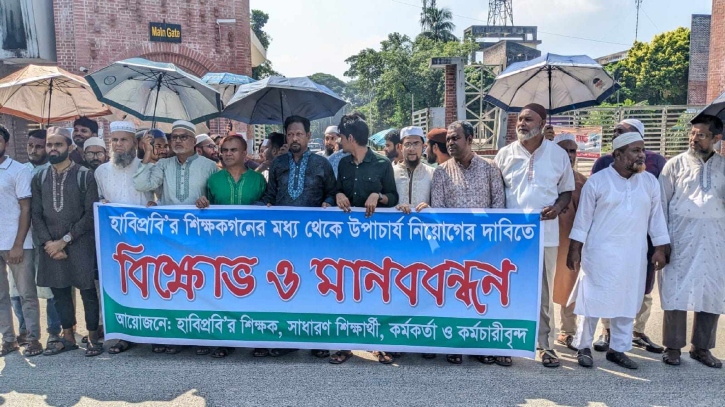 দিনাজপুরের হাজী মোহাম্মদ দানেশ বিজ্ঞান ও প্রযুক্তি বিশ্ববিদ্যালয়ে (হাবিপ্রবি) নিজ বিশ্ববিদ্যালয়ের শিক্ষককে উপাচার্য নিয়োগের দাবিতে বিক্ষোভ ও মানববন্ধন করেছেন শিক্ষক,