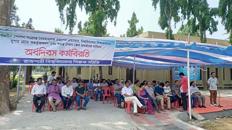 সর্বজনীন পেনশনের প্রত্যয় স্কিমকে বৈষম্যমূলক আখ্যা দিয়ে এটি প্রত্যাহারসহ তিন দফা দাবিতে অর্ধদিবস কর্মবিরতি কর্মসূচি পালন করেছে রাজশাহী বিশ্ববিদ্যালয় (রাবি)
