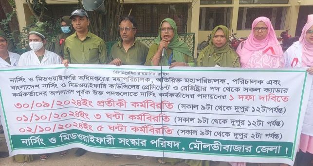 মৌলভীবাজারে নার্সিং কর্মকর্তা ও শিক্ষার্থীদের প্রতীকী কর্মবিরতি পালন