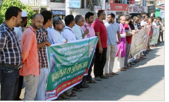 সাংবাদিক হোসাইন আহমদের ওপর সন্ত্রাসী হামলার প্রতিবাদে মৌলভীবাজারে মানববন্ধন