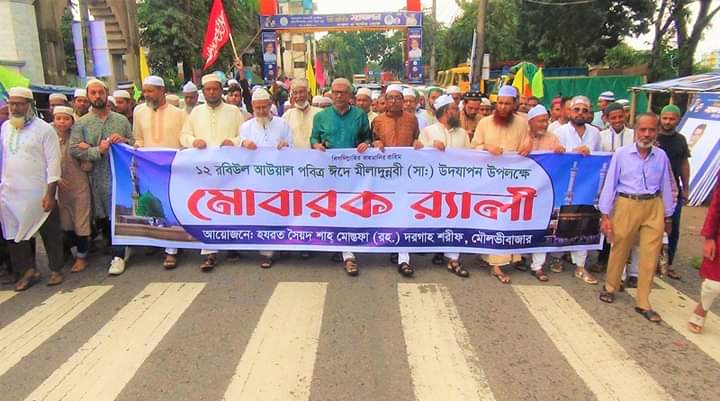 মৌলভীবাজারে পবিত্র ঈদে মিলাদুন্নবী (সা.) উদযাপন উপলক্ষে হযরত সৈয়দ শাহ মোস্তফা (র.) দরগাহ শরীফের উদ্যোগে শহরে এক মোবারক র্যালী বের